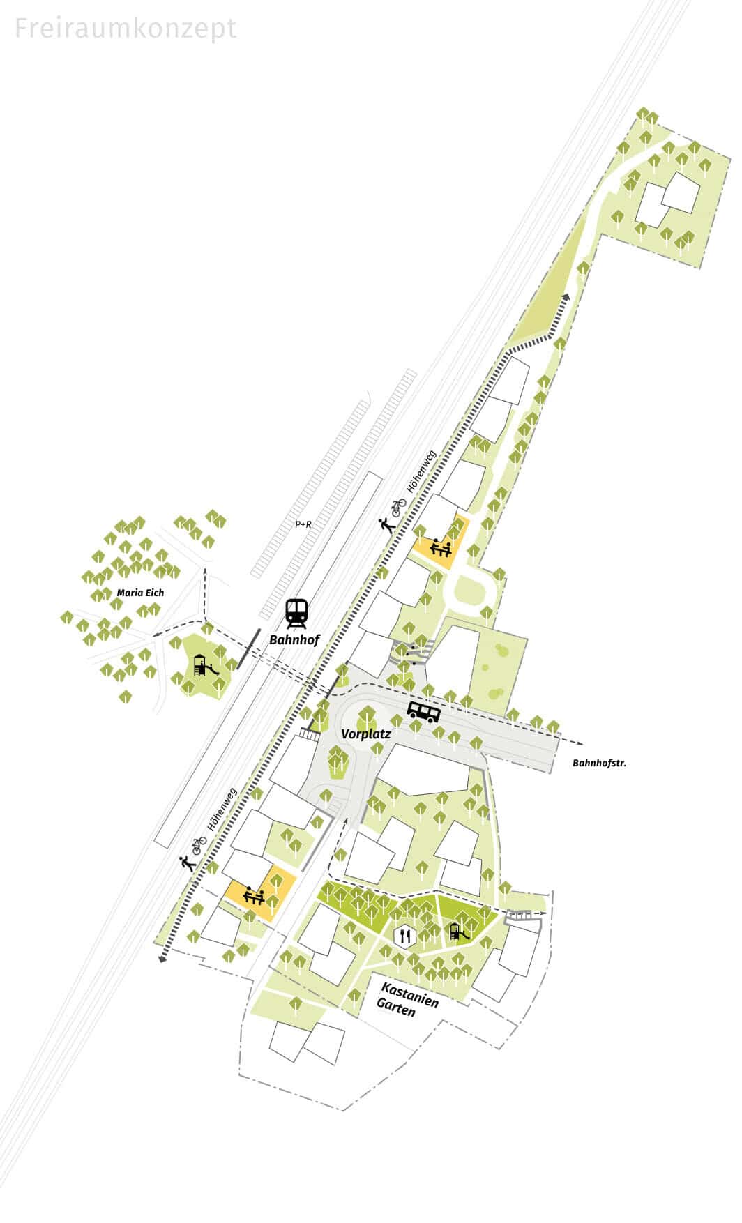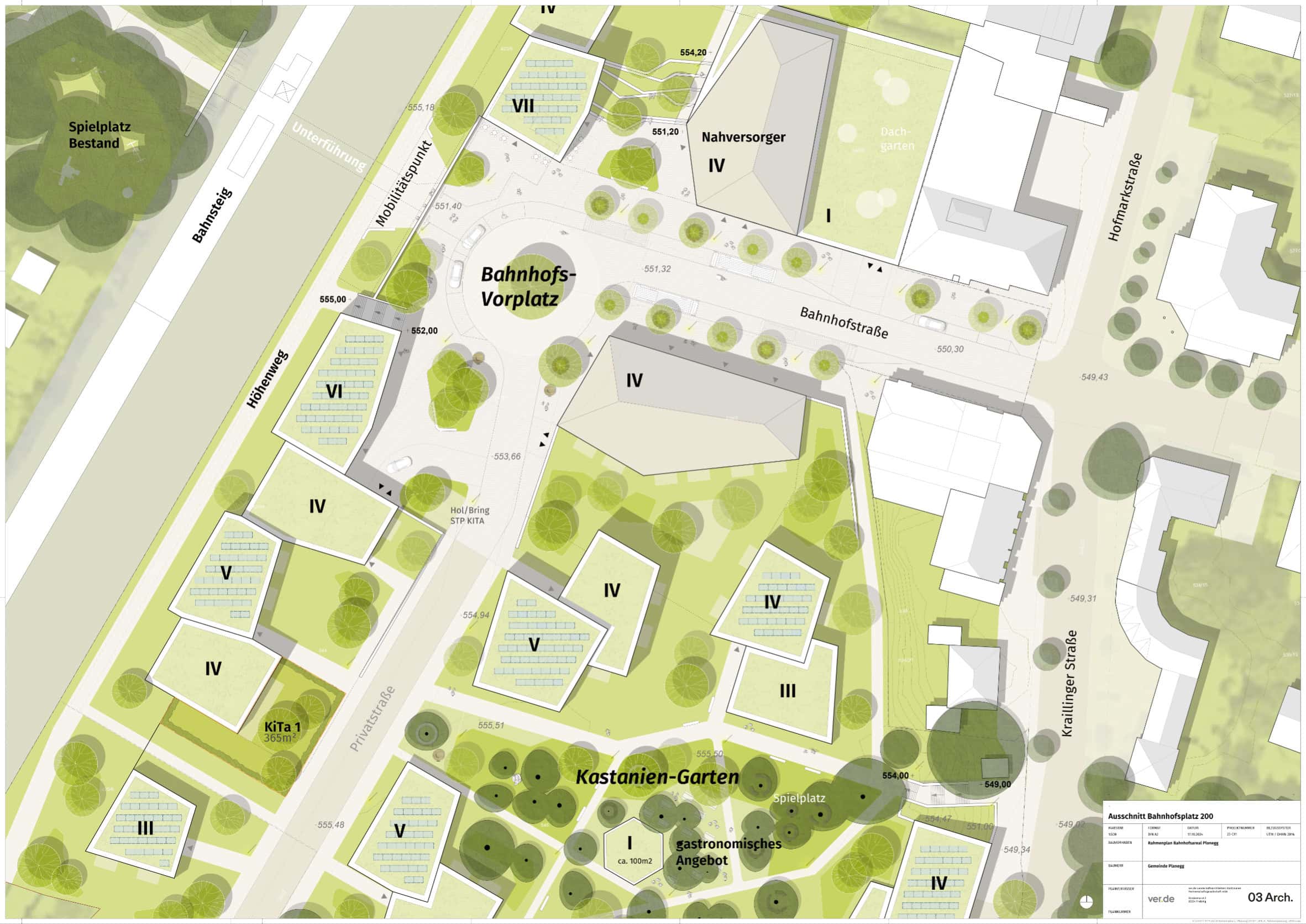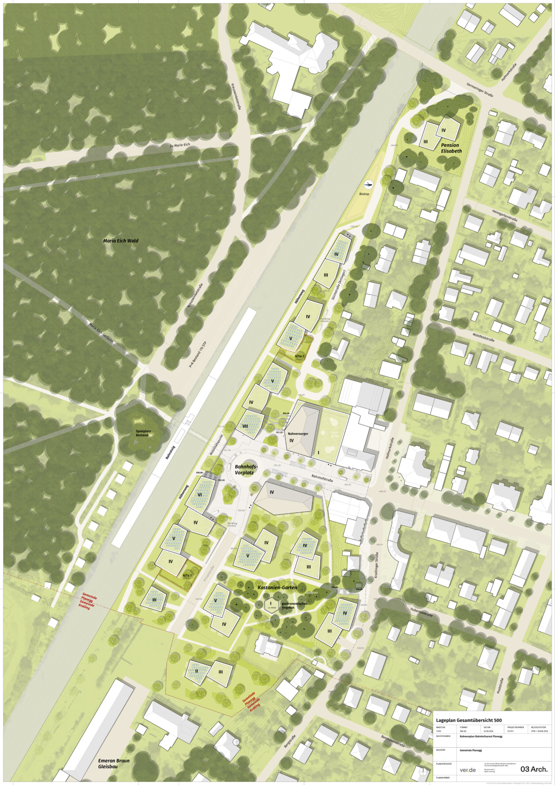 Der Rahmenplan für das Bahnhofsareal Planegg sieht eine polygonale Bebauungsstruktur und eine neue Ordnung der öffentlichen Freiflächen vor. Die gemeindeeigenen Grundstücke entlang der Bahnlinie sowie das ehemalige Heide-Volm-Areal, auf dem der bekannte Biergarten stand, werden transformiert. Aus gewachsenen Orten entstehen neue Identitäten für die Bürger*innen Planeggs. Der wertvolle Baumbestand mit alten Kastanien im südlichen Teil soll erhalten und zum öffentlichen Park – dem sogenannten Kastaniengarten entwickelt werden.